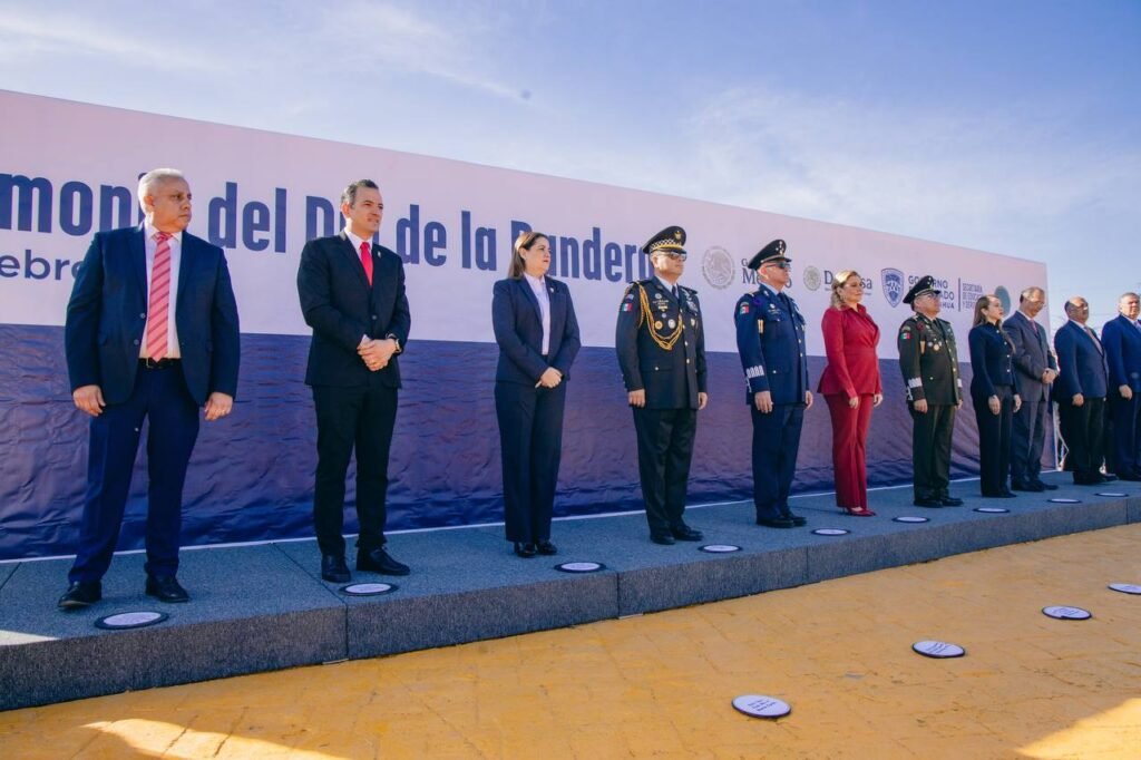 Chihuahua, Chih., a 24 de febrero de 2025. En conmemoración del 124º aniversario del Día de la Bandera, el alcalde de Chihuahua, Marco Bonilla, participó en la ceremonia de izamiento del lábaro patrio en la Plaza de El Palomar, acompañado por la gobernadora Maru Campos y autoridades de la Secretaría de la Defensa Nacional (SEDENA).
