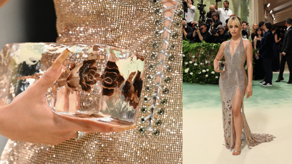 La joven estrella literalmente llevaba una flor de oro dentro de un cubo de hielo, que se derretía gradualmente mientras caminaba por el evento. Esta extravagante adición a su atuendo ya de por sí impresionante, capturó la atención de los espectadores y medios de comunicación por igual.