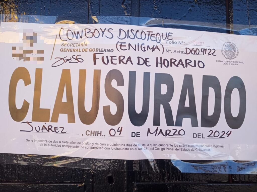 - Salón de baile “Cowboy Discoteque (Enigma)” (Ciudad Juárez): Clausurado por operar fuera de horario.
