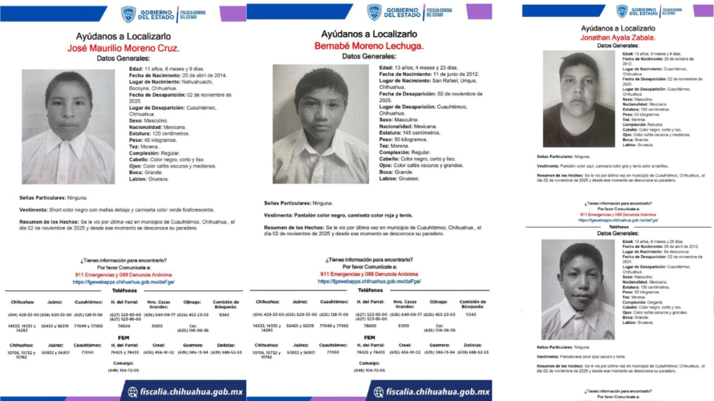 Cuauhtémoc, Chih.- La comunidad del municipio de Cuauhtémoc se encuentra en alerta tras la desaparición de cuatro menores de edad ocurrida el pasado 2 de noviembre de 2025. La Fiscalía General del Estado (FGE) de Chihuahua emitió las fichas de búsqueda correspondientes y solicitó la colaboración de la ciudadanía para su pronta localización.