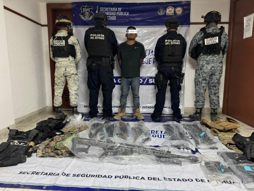 El individuo identificado como Valentín M.C., de 26 años, fue arrestado por la portación ilegal de arma de fuego. Tras su captura, los uniformados realizaron un patrullaje en la zona, donde localizaron diversas armas largas y equipo táctico presuntamente utilizado por grupos criminales.