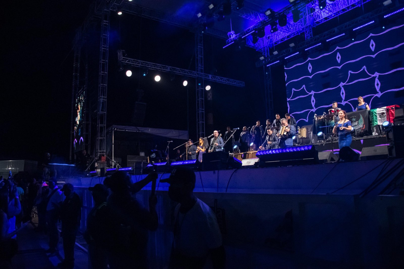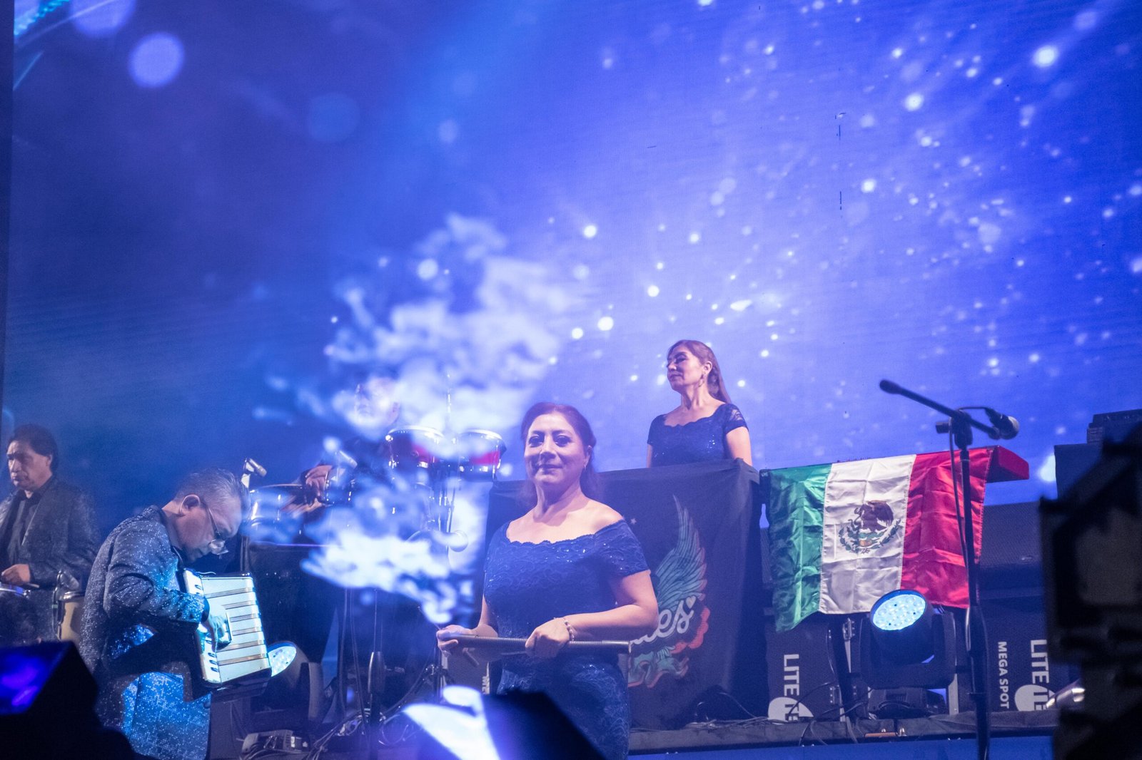 Con una pantalla gigante al centro, y cinco bajo la tarima de sus músicos, además de efectos de humo y luces de bengala, Los Ángeles Azules ofrecieron un espectáculo de primera.