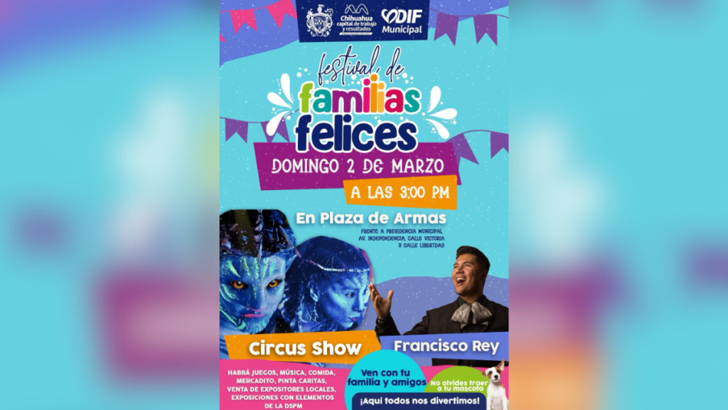 Chihuahua, Chih.- El Gobierno Municipal, a través del DIF Municipal, reiteró la invitación a la ciudadanía para asistir al «Festival Familias Felices», evento que se llevará a cabo este domingo 2 de marzo en el Centro Histórico de la ciudad, a partir de las 3:00 de la tarde, en el marco del Día de la Familia.