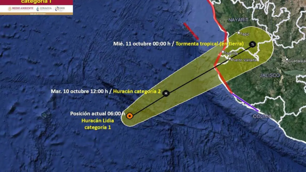 El Servicio Meteorológico Nacional (SMN) ha emitido advertencias significativas sobre los posibles impactos de Lidia en las regiones costeras de México. En este momento, el centro del huracán Lidia se encuentra aproximadamente a 380 km al oeste-suroeste de Puerto Vallarta, Jalisco, y a 475 km al sur-sureste de Cabo San Lucas, Baja California Sur. Lidia presenta vientos máximos sostenidos de 140 km/h y ráfagas de hasta 165 km/h, desplazándose hacia el este-noreste a 17 km/h. Se espera que las lluvias generadas por Lidia provoquen deslaves, aumento en los niveles de ríos y arroyos, desbordamientos e inundaciones en áreas de Nayarit, Jalisco, Colima y Michoacán. Además, se prevén lluvias intensas en Baja California Sur, Sinaloa y Durango. El SMN ha aconsejado a la población seguir las recomendaciones de Protección Civil debido a la posibilidad de descargas eléctricas.