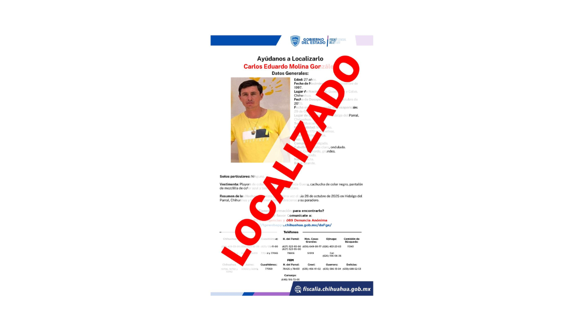Hidalgo del Parral, Chih.- La Fiscalía de Distrito Zona Sur informó que, tras activar los protocolos de búsqueda, elementos de la Agencia Estatal de Investigación lograron localizar sano y salvo a Carlos Eduardo M. G., joven de 27 años que había sido reportado como desaparecido en la ciudad de Parral.