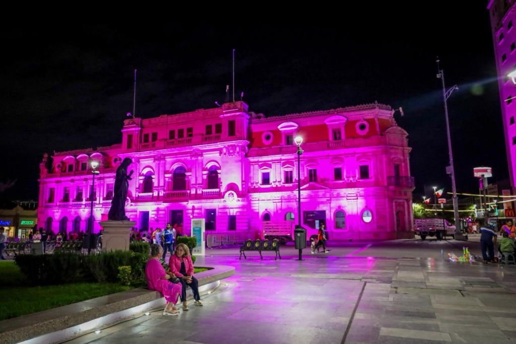 Con motivo del Mes Rosa, el Gobierno Municipal de Chihuahua iluminó de rosa los edificios de la Plaza de Armas, en el Centro Histórico, como símbolo de solidaridad y esperanza en la lucha contra el cáncer de mama.