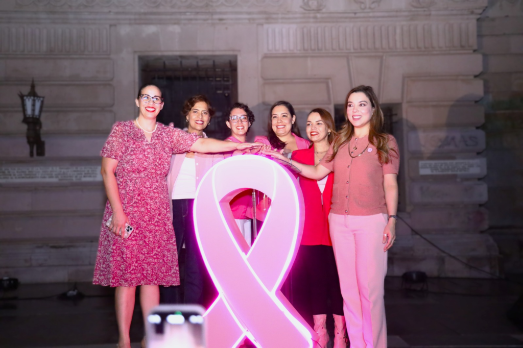 La jornada concluyó con la iluminación rosa de la Presidencia Municipal y de los edificios emblemáticos del primer cuadro de la ciudad, reforzando el mensaje de prevención y unión en la lucha contra el cáncer de mama.
