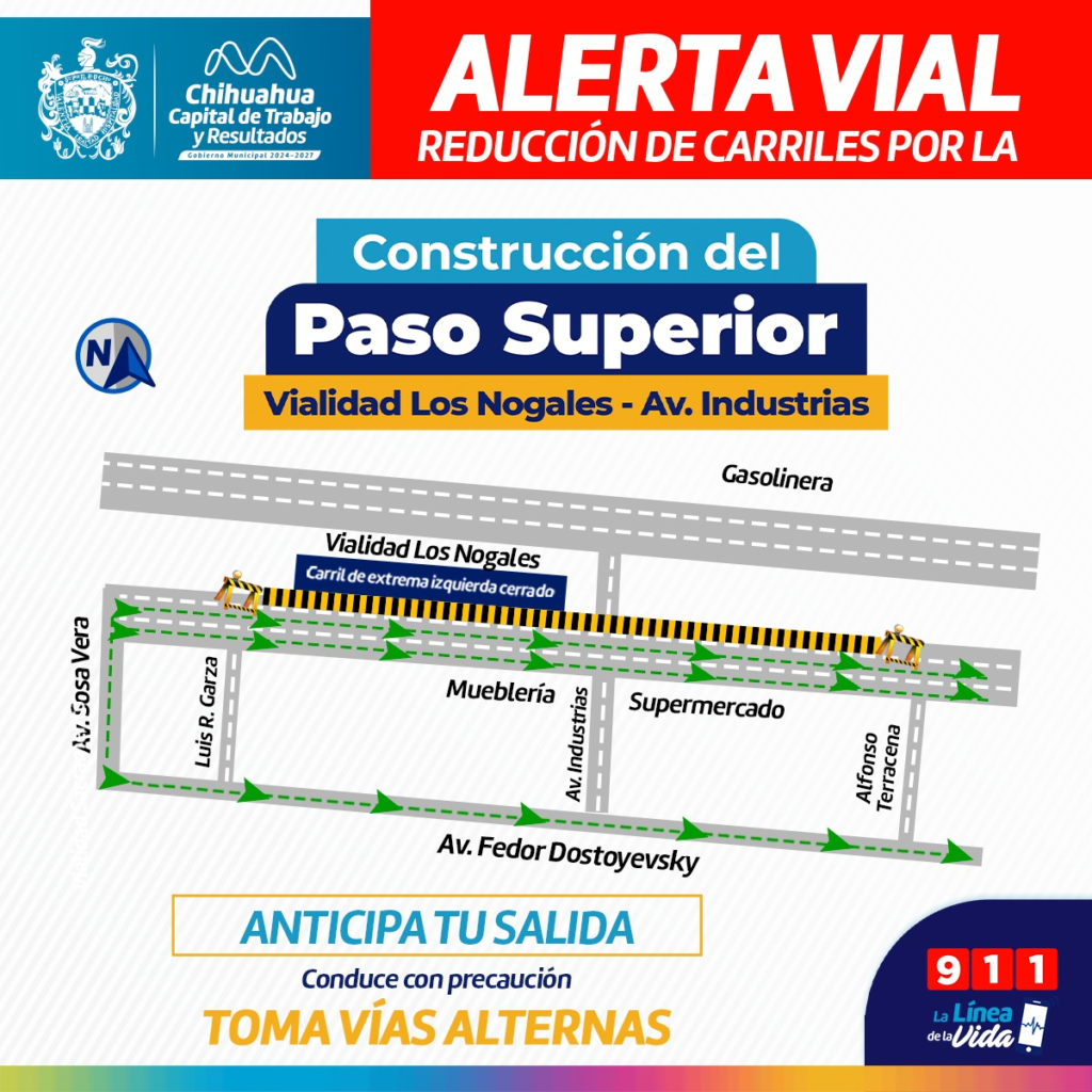 Chihuahua, Chih. – El Gobierno Municipal, a través de la Dirección de Obras Públicas, informó que se reducirá de tres a dos carriles el cuerpo sur de la Vialidad Los Nogales, debido a los trabajos previos a la construcción del Puente Superior Vialidad Los Nogales.