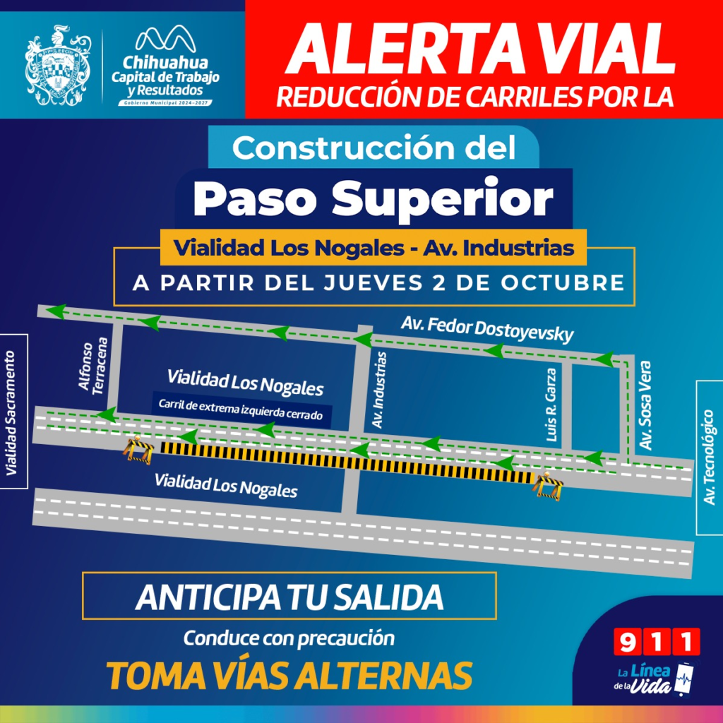 El Gobierno Municipal, a través de la Dirección de Obras Públicas, implementará una reducción de tres a dos carriles en el cuerpo sur de la Vialidad Los Nogales, como parte de las actividades previas a la construcción del Puente Superior Vialidad Los Nogales.