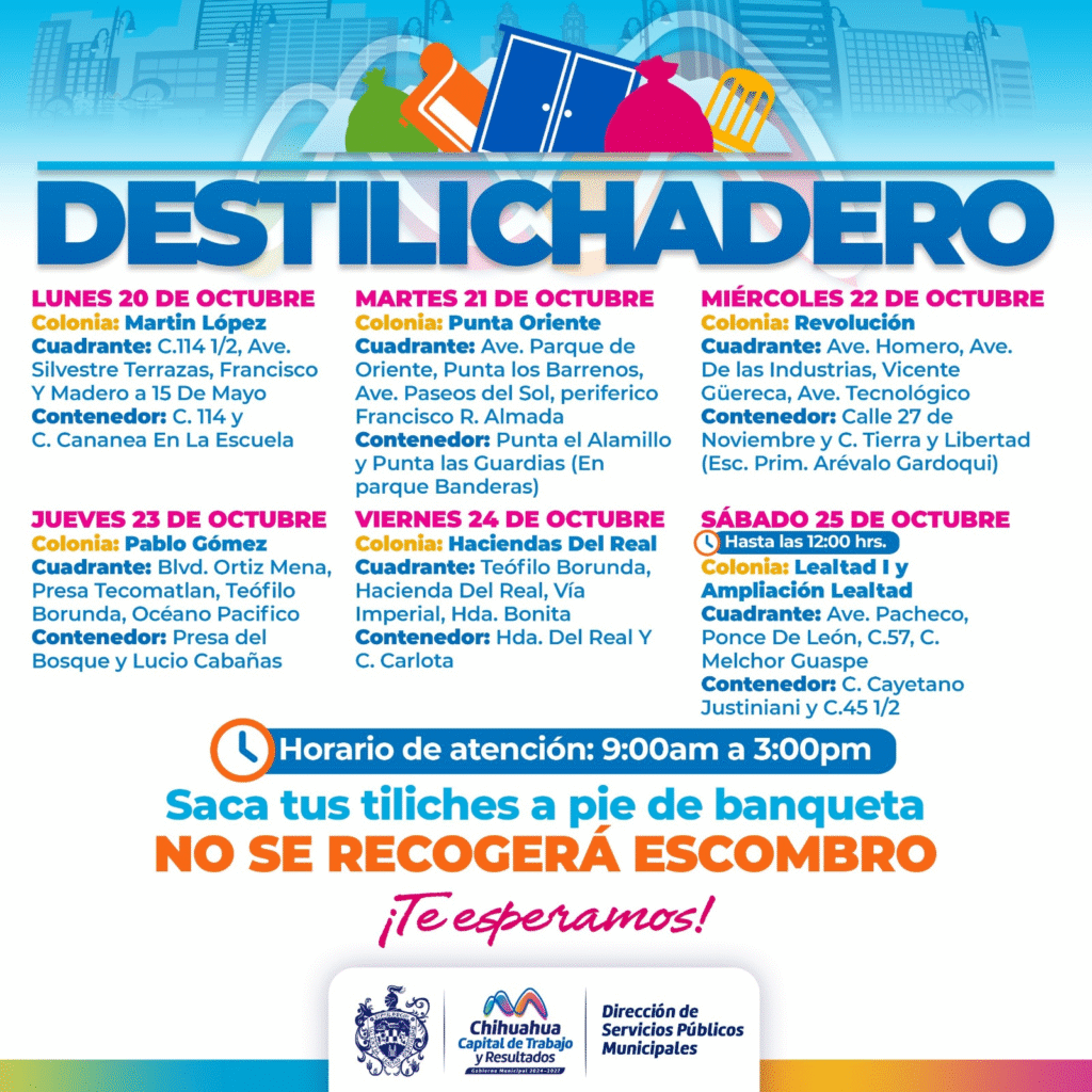 Para evitar la acumulación de basura de gran tamaño en los hogares, que podría generar plagas o problemas de salud, el Gobierno Municipal, a través de la Dirección de Servicios Públicos Municipales, anunció el calendario del programa Destilichadero, que se realizará del 20 al 25 de octubre en siete colonias de la capital.