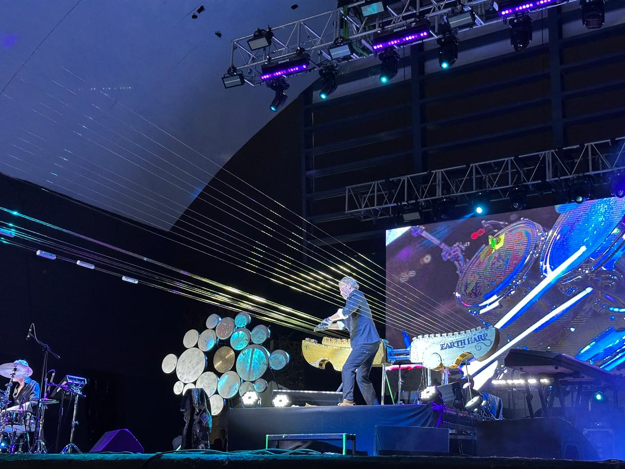 La imponente arpa gigante, creada e interpretada por el artista estadounidense William Close, transformó el escenario del Palomar en un instrumento monumental, cuyo sonido majestuoso capturó la atención y admiración del público en cada nota.